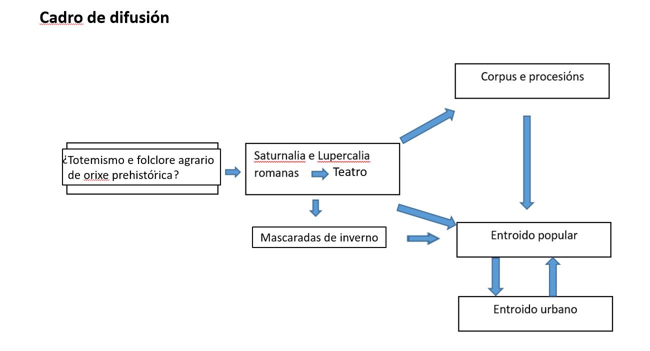 É certo que os entroidos europeos relaciónanse con festas romanas de inversión das xerarquías como as Saturnalias e as Lupercalias, e que neles poden atoparse, quizas, restos dun folclore agrario neolítico que perviviron tamén noutras festas invernais como as do Asno, as dos Tolos ou as de Reis e pasaron na Baixa Idade Media ás procesións do Corpus, dende as cales volveron máis tarde ao entroido, tanto popular como urbano. En calquera caso, o entroido galego, tal e como o coñecemos, ten unha orixe tardomedieval e paréceme esaxerado buscarlles ás máscaras galegas orixes prehistóricas, ou interpretar as abundantes parodias de sementeiras do entroido como "aradas rituais" e cultos de fertilidade cando non son máis que farsas para facer rir, o mesmo que outras parodias de oficios.